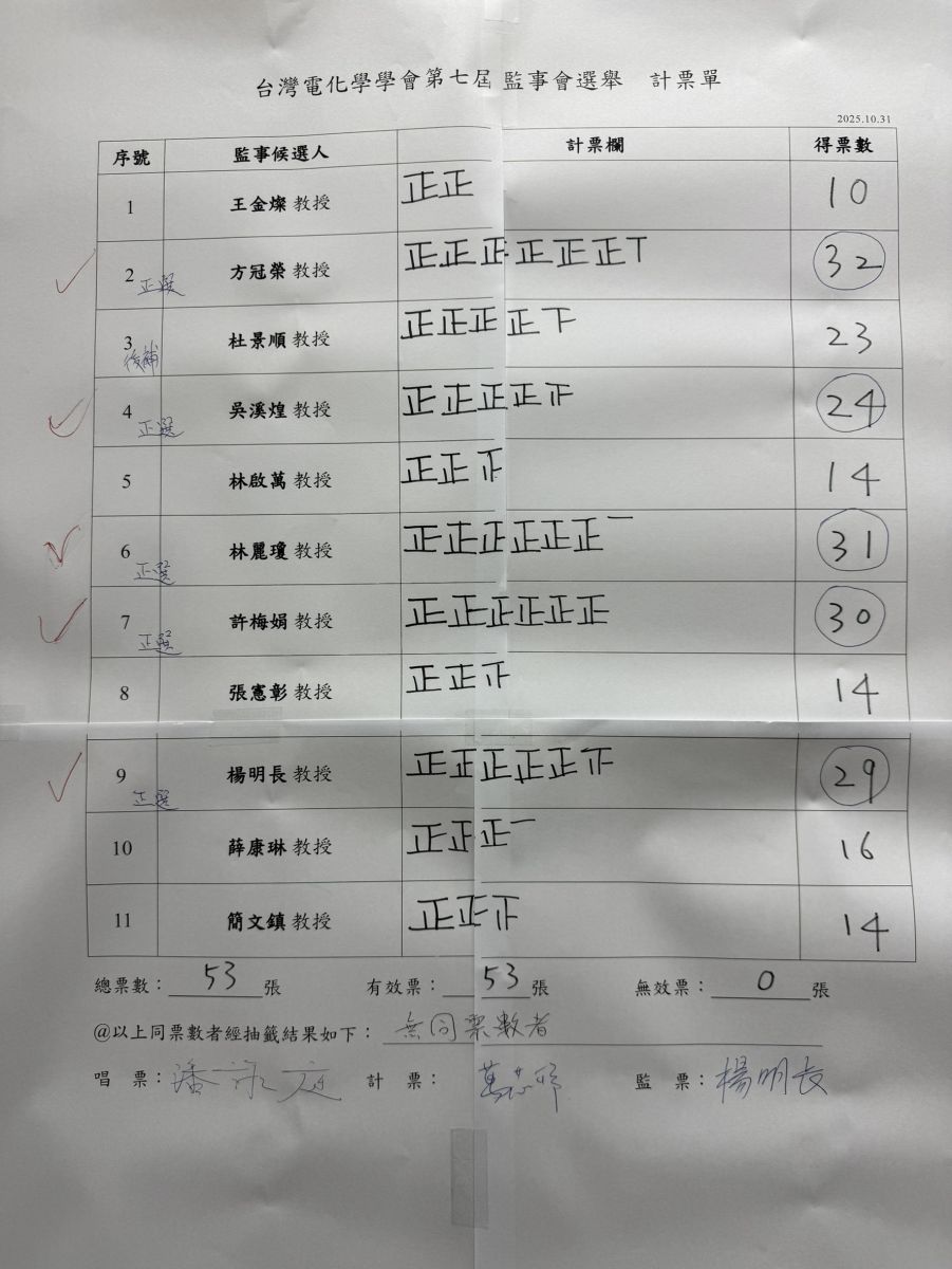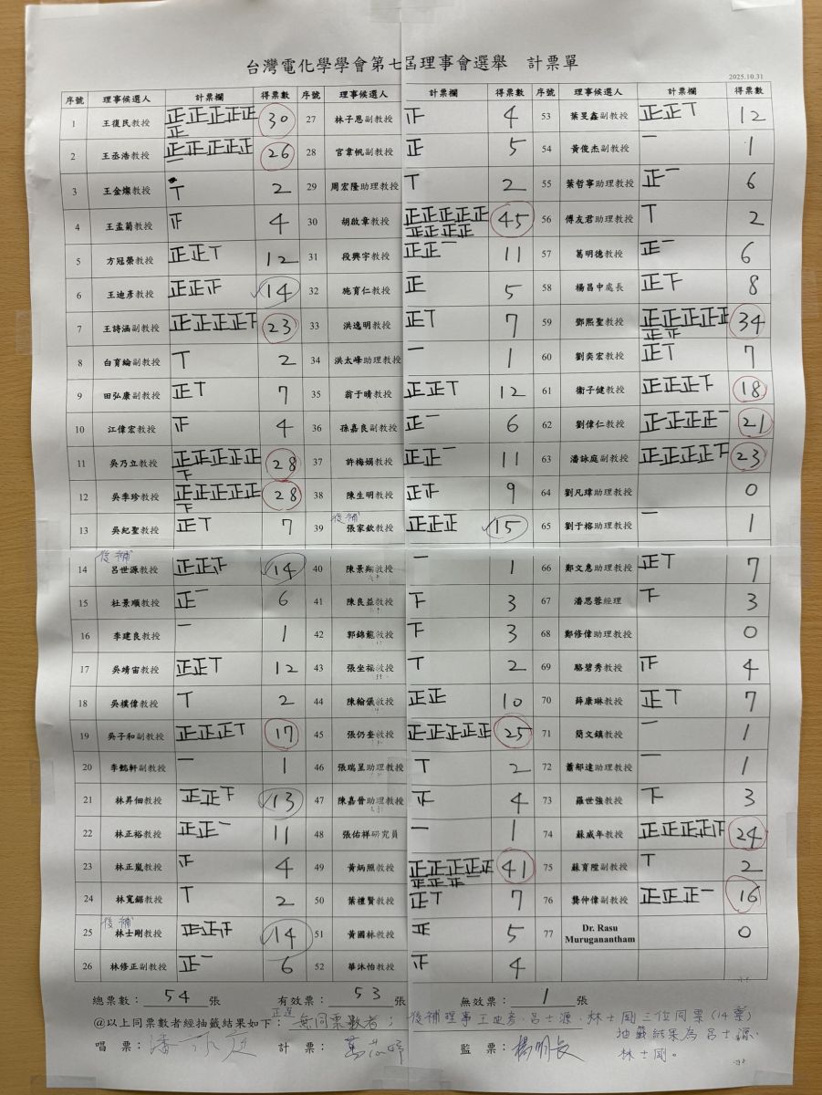 學會於114/10/31(五),於國立成功大學進行第七屆理監事選舉開票,並預計於11/1(六)下午ICGET年會時召開會員大會暨常務理監事選舉。新任理監事名單如下: